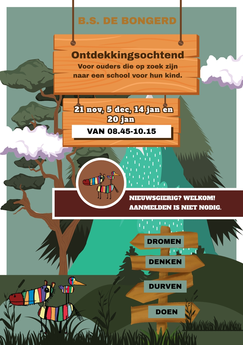 De Bongerd is een school die groots is in het 'klein' zijn. Iedereen kent elkaar, de lijntjes zijn kort. Onze school is een afspiegeling van de huidige maatschappij. Wij stellen het kind centraal en zijn gericht op de totale ontwikkeling van het kind. Ons bevlogen team geeft hier vorm aan middels het concept Dromen, Denken, Doen. In onze schoolgids kunt u meer lezen over onze visie.